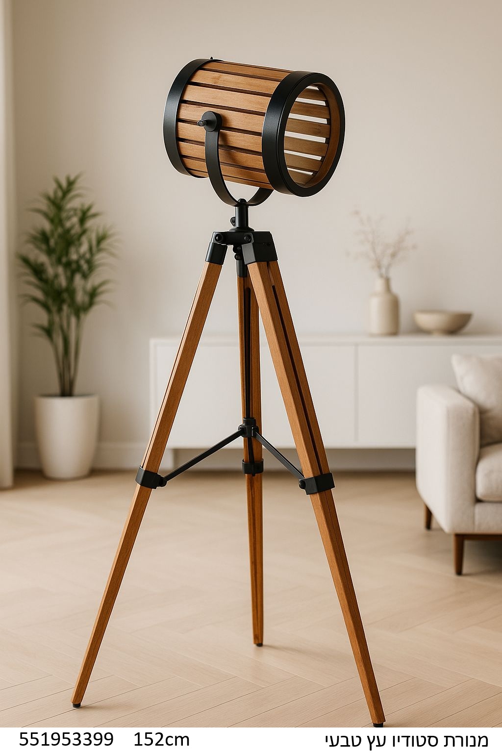 מנורת סטודיו עומדת בעיצוב פרימיום עם חצובת עץ טבעי וגוף תאורה מתכתי שחור בסגנון וינטג’ יוקרתי, המשלבת נוכחות מרשימה ותאורה ממוקדת ליצירת אווירה חמה ומעוצבת בסלון, בפינת ישיבה או בחלל עבודה.