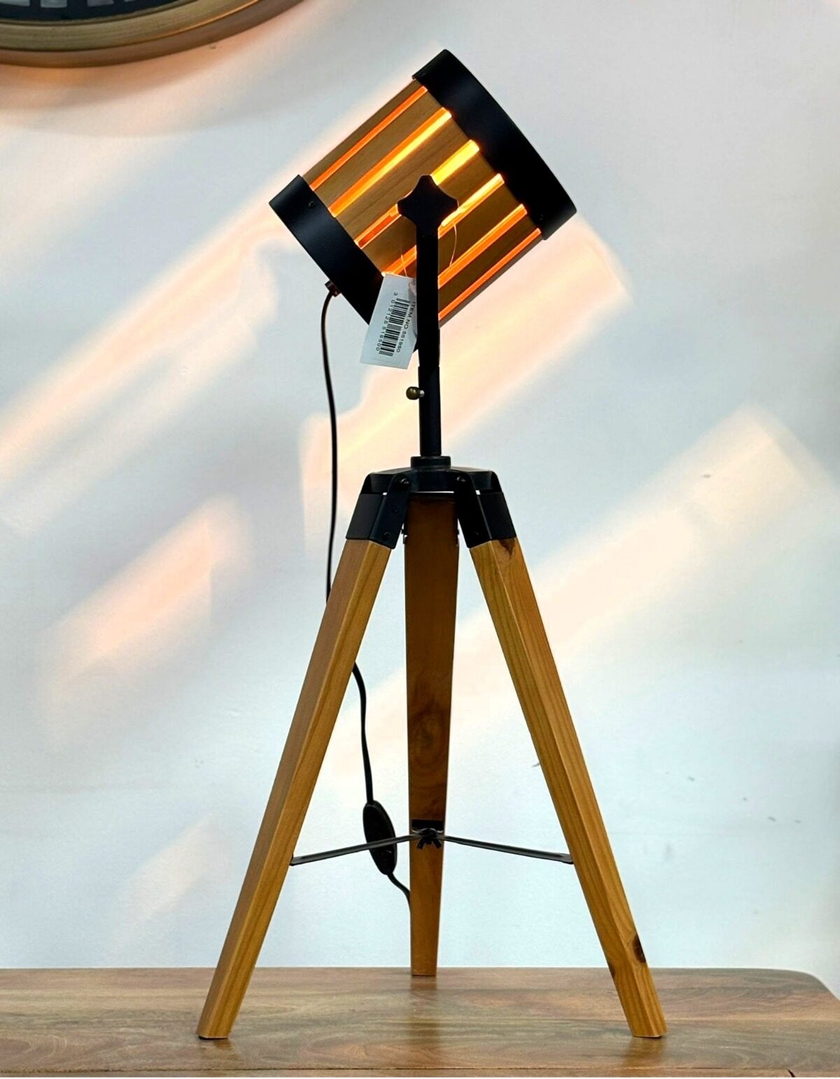 מנורת סטודיו שולחנית בעיצוב תעשייתי-יוקרתי, משלבת רגלי חצובה מעץ טבעי מלא עם גוף מתכת שחור ופסי תאורה חמים ליצירת אווירה מרשימה ומיקוד מושלם של אור. פתרון תאורה אידאלי לשולחן עבודה, קונסולה, מדף או פינת קריאה, המעניק לחלל מראה יוקרתי ונוכחות עיצובית בולטת.
