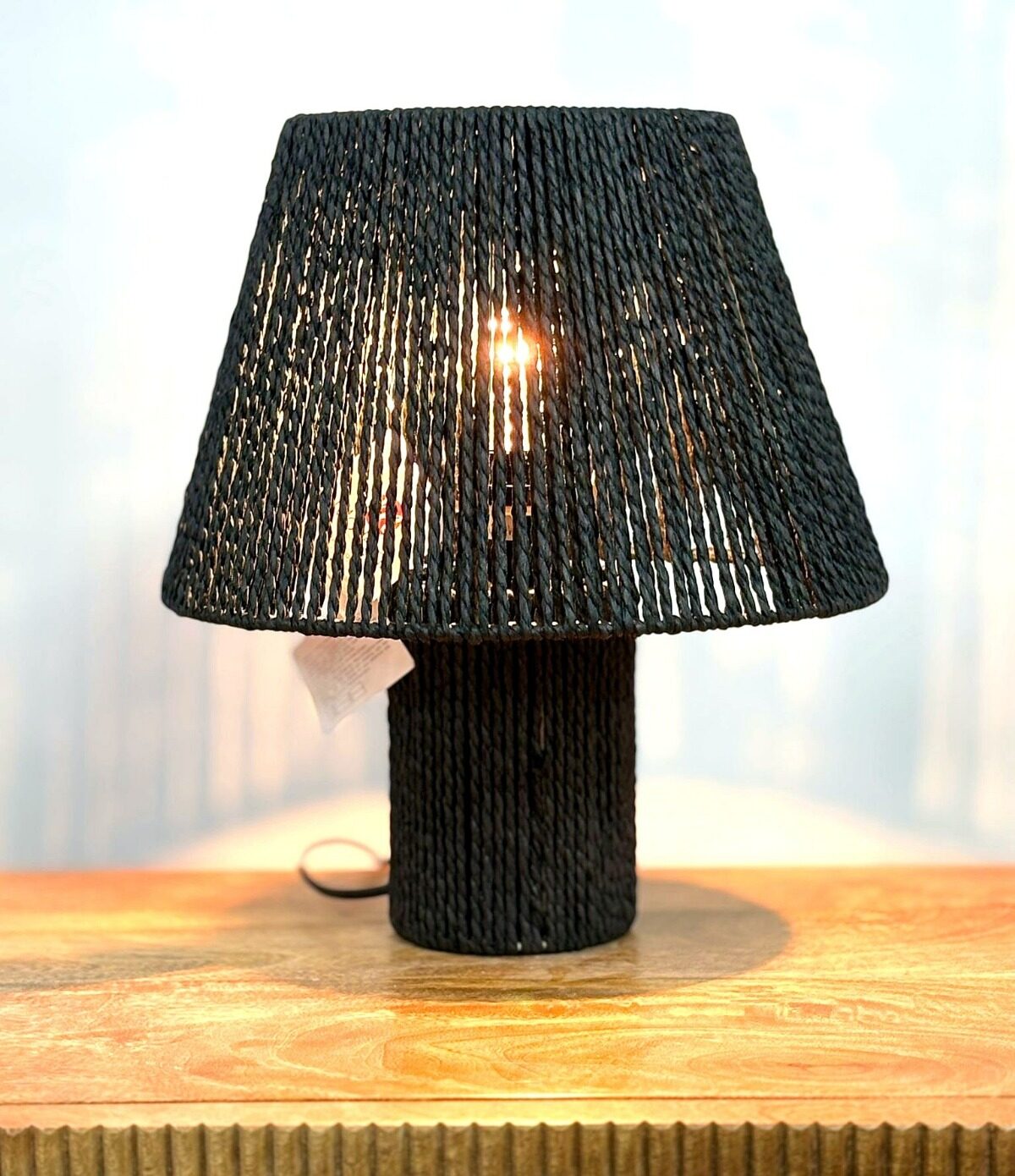 מנורת שולחן מחבל שחור בעבודת קליעה צפופה ומרשימה, המייצרת משחק אור וצל ייחודי ומעניקה לחלל מראה דרמטי, חמים ומלא עומק. הבחירה המושלמת לפינת סלון מעוצבת, שידת לילה יוקרתית או כאלמנט תאורה דקורטיבי מרכזי.