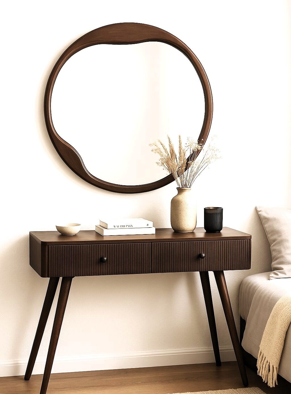 מראה עגולה אמורפית עשויה עץ מלא כהה היא יצירת עיצוב אלגנטית שמשלבת נוכחות יוקרתית עם חמימות טבעית.