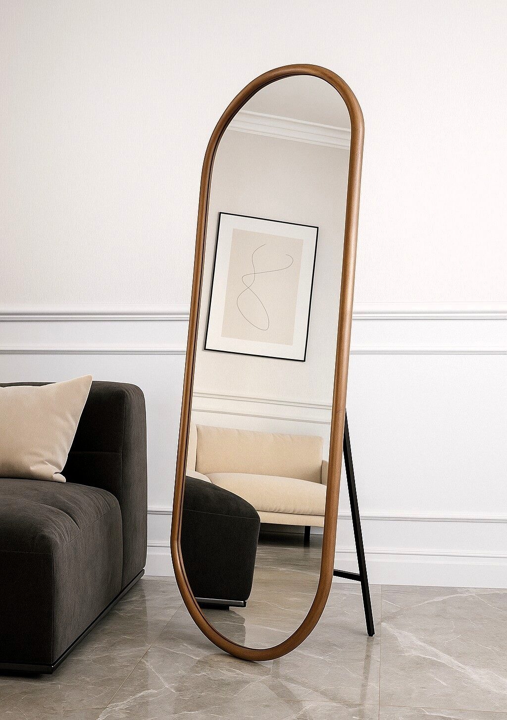 מראת גוף עם רגל עץ טבעי במידות 60×170 ס״מ משלבת אלגנטיות חמה עם קווים מודרניים נקיים. המסגרת המעוגלת בגוון עץ טבעי יוצרת תחושת רוך וחמימות, והעמדה על רגל אחורית שחורה מוסיפה יציבות ונוכחות עיצובית מרשימה.