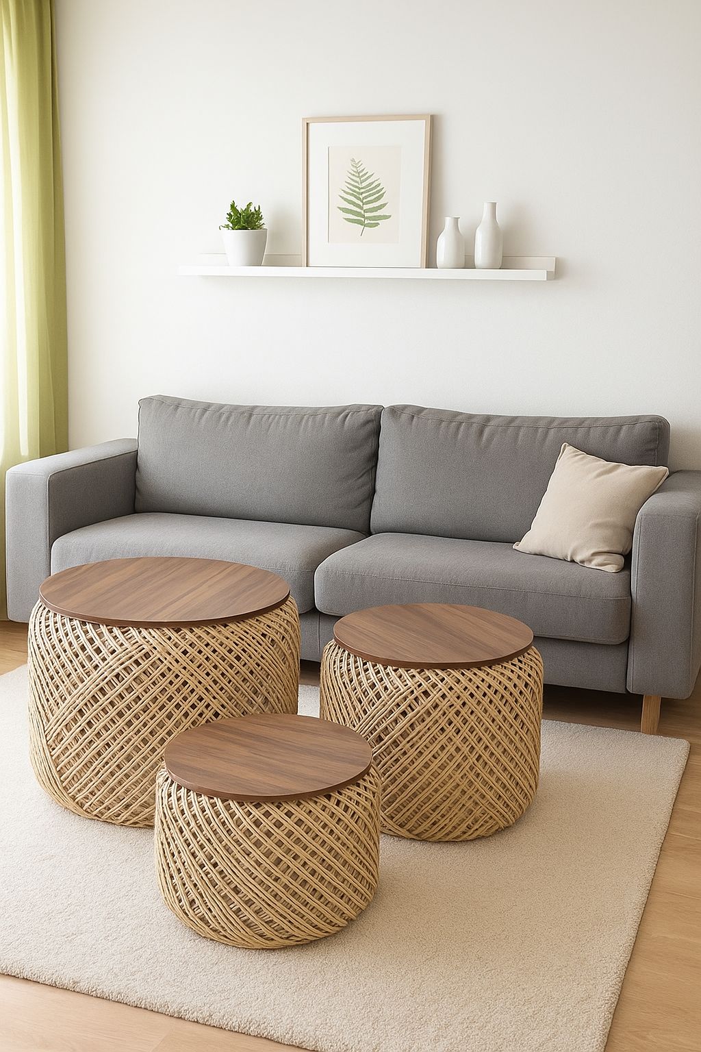 הכניסו חמימות טבעית ותחכום מודרני לחלל עם סט שלושה שולחנות בעיצוב עגול, המשלבים משטח עץ חלק עם בסיס ראטאן קלוע בעבודת יד. שילוב החומרים יוצר מראה חמים, קליל ויוקרתי המתאים לסלון, לפינת ישיבה או לחלל אירוח. ניתן להציב את השולחנות יחד או בנפרד ליצירת קומפוזיציה דינמית ומעוצבת.