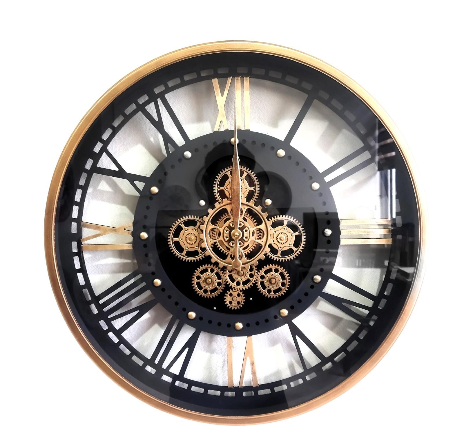 שעון דקורטיבי גלגלי שיניים בקוטר 60 ס״מ הוא פריט עיצוב מרהיב שמשלב בין יוקרה קלאסית למראה תעשייתי מודרני. גוף השעון עשוי מתכת בגוון שחור מט, עם מסגרת בגוון זהב עתיק ומרכז מרהיב של גלגלי שיניים דקורטיביים בגוון זהוב מבריק.