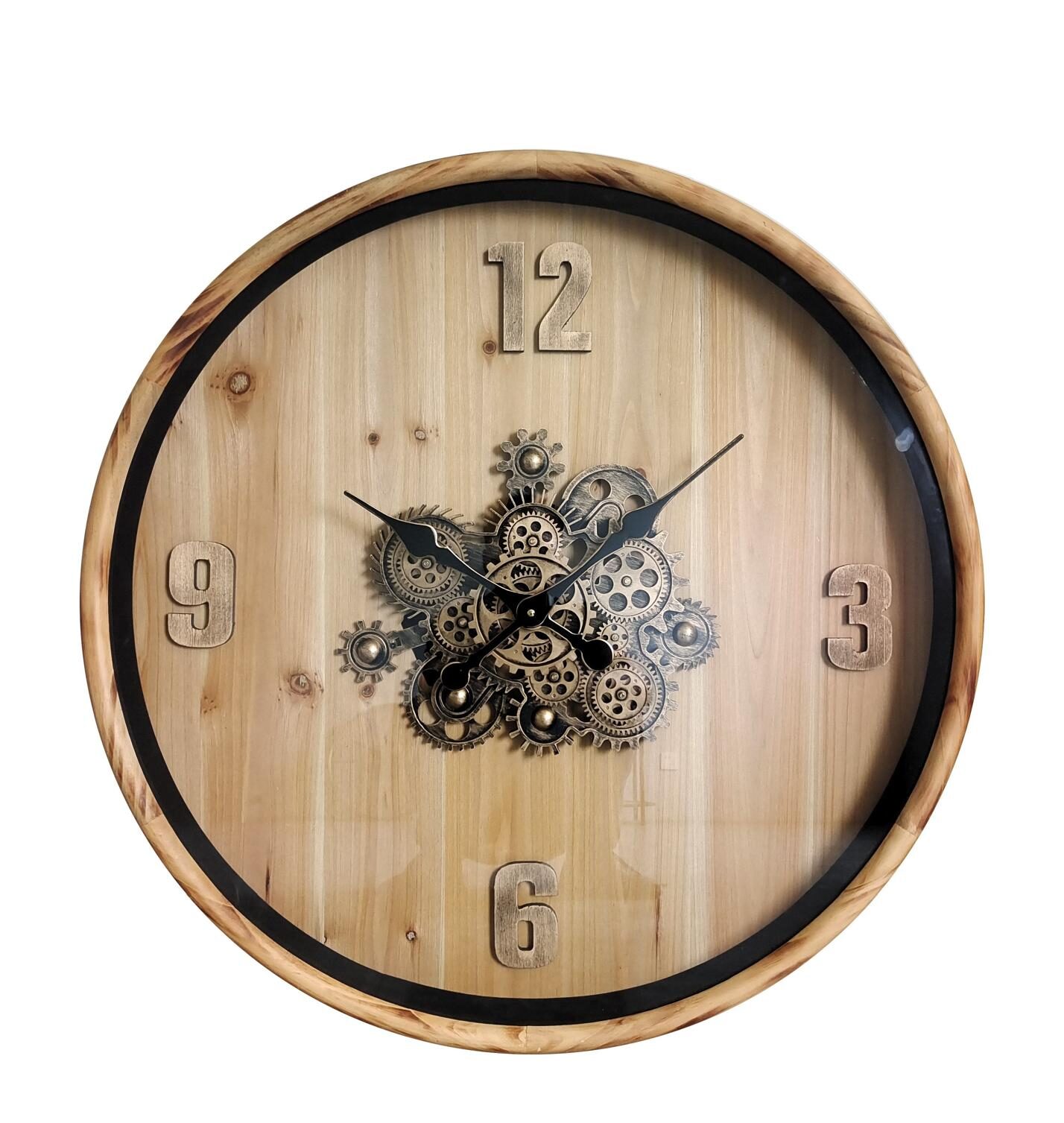 שעון עץ טבעי גלגלי שיניים בקוטר 60 ס״מ מביא הביתה שילוב נדיר של עיצוב כפרי וחומריות טבעית עם טאץ׳ תעשייתי יוקרתי. גוף השעון עשוי עץ מלא בגוון טבעי, והמרכז מעוטר בגלגלי שיניים מתכתיים בגוון זהב עתיק שמוסיפים תחושת עומק ותנועה.