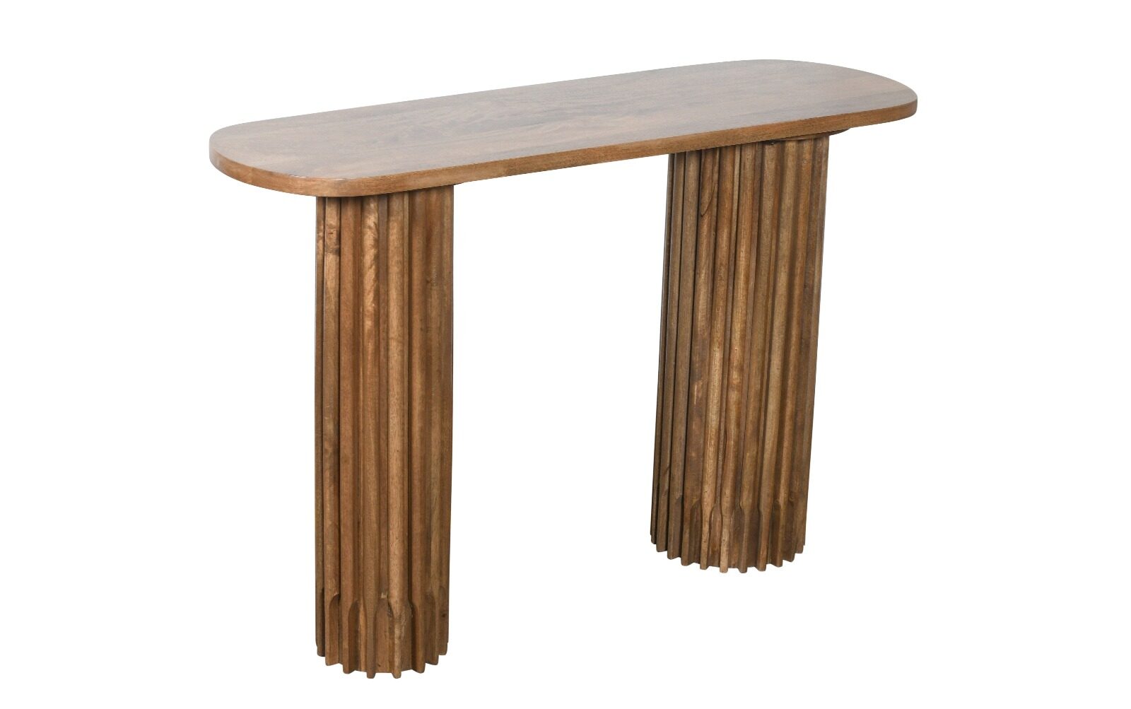 קונסולה מיוחדת בעיצוב אובלי עם רגליים גליליות מעץ מנגו מלא בגימור טבעי. שילוב מושלם של עיצוב פיסולי ונוכחות חמימה – רהיט שישדרג כל כניסה או קיר ריק עם טאץ’ ייחודי.