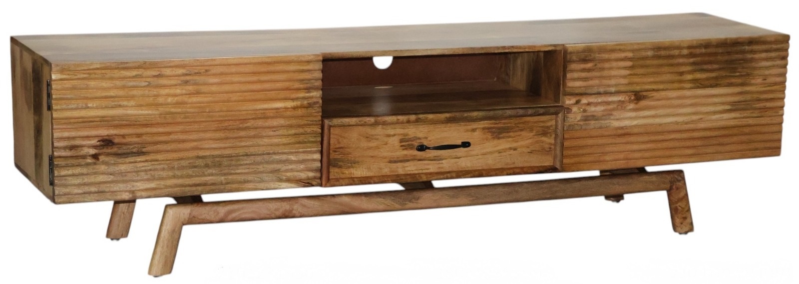 מזנון מעוצב לסלון עשוי עץ מנגו מלא בגוון טבעי עם טקסטורה חיה. כולל מגירה מרכזית, מדף פתוח ושתי דלתות צד בגימור חריצים עדינים. רגליים משופעות משלימות את המראה החם והעדכני.
