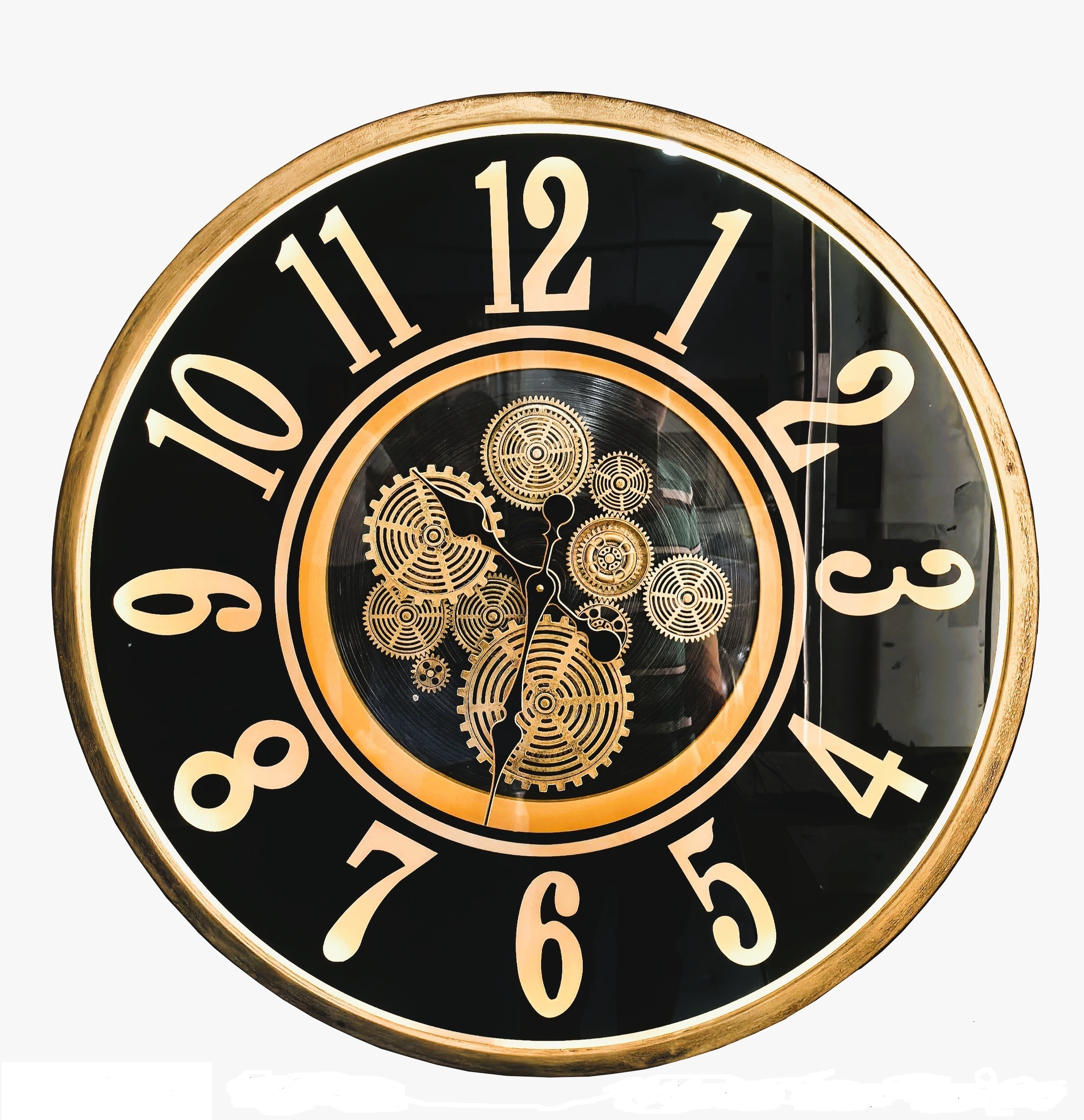 שעון גלגלי שיניים עם תאורת לד בקוטר 80 ס״מ הוא פריט עיצוב עוצר נשימה שמשלב חדשנות ואלגנטיות. גוף מתכת בצבע שחור וזהב, מנגנון גלגלי שיניים מרשים הנראה דרך הזכוכית, ותאורת לד היקפית שמאירה את הקיר ויוצרת אווירה יוקרתית ומודרנית במיוחד.
