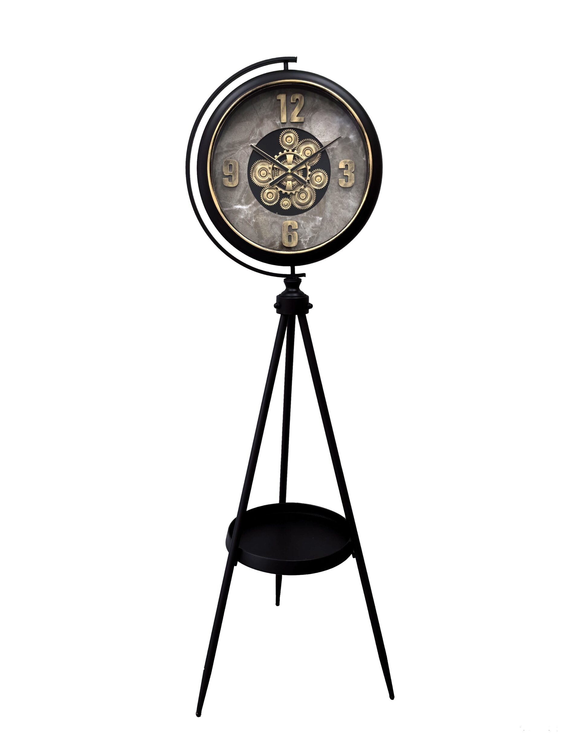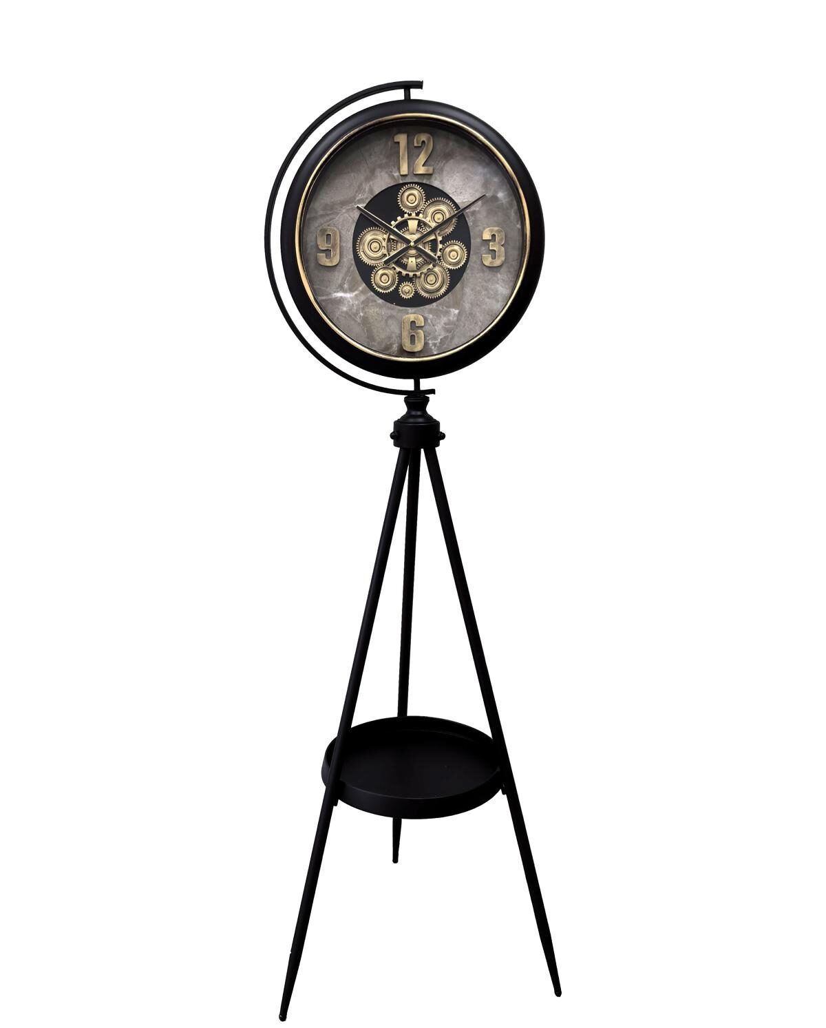 שעון גלגלי שיניים עומד על רגליים בגובה 192 ס״מ וברוחב 62 ס״מ, בעיצוב מתכתי שחור עם מראה תעשייתי יוקרתי. השעון משלב גלגלי שיניים מוזהבים הנראים דרך לוח זכוכית שקוף, ומוצב על חצובה אלגנטית המוסיפה נוכחות ועומק לכל חלל.