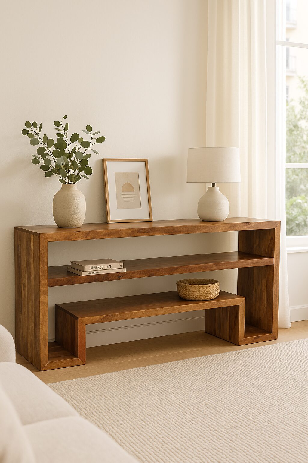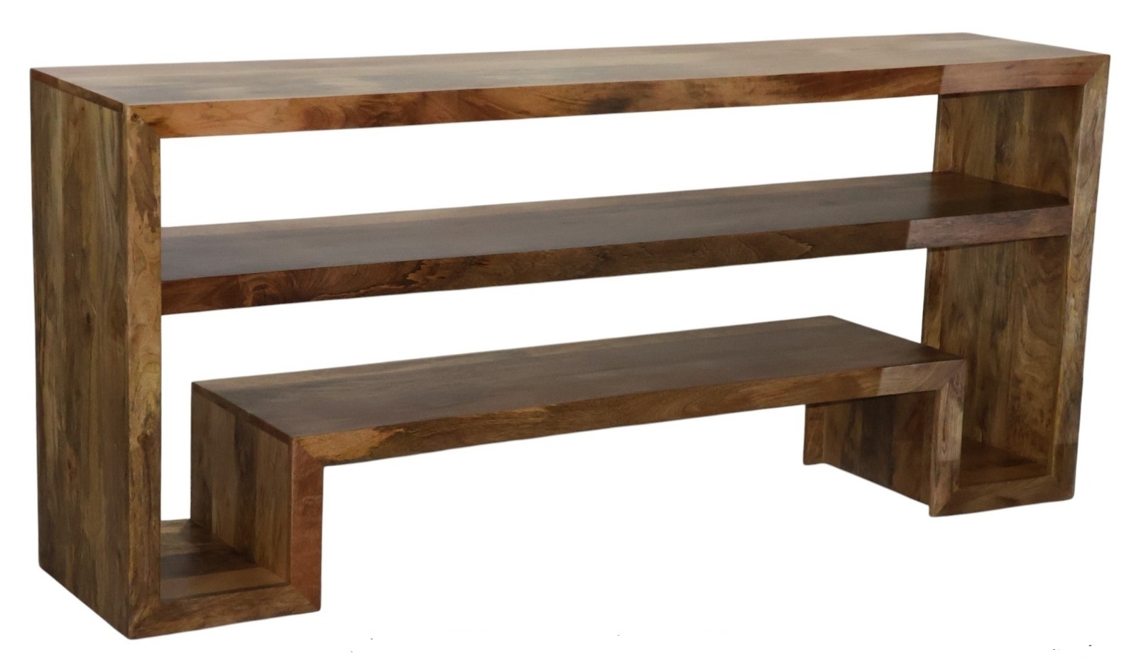 שידת עץ ייחודית עשויה עץ מנגו מלא בגוון טבעי, עם שלושה מדפים פתוחים בגבהים משתנים בעיצוב גאומטרי מקורי. אידיאלית לשימוש כשידת טלוויזיה, מדף תצוגה, או רהיט אחסון לסלון ומבואת כניסה.