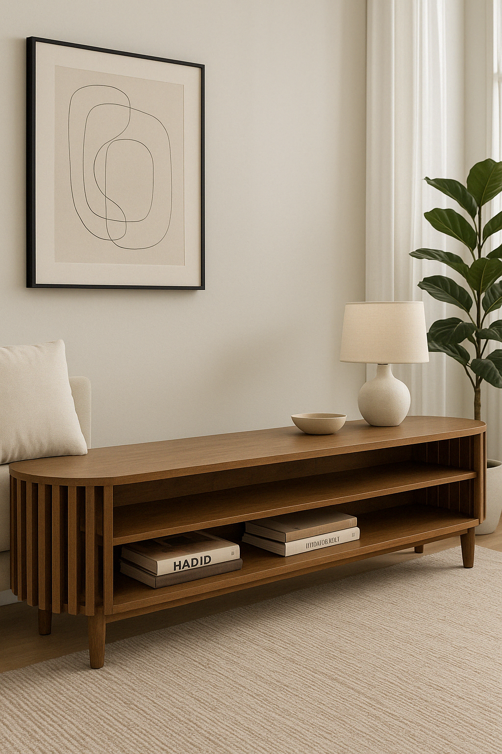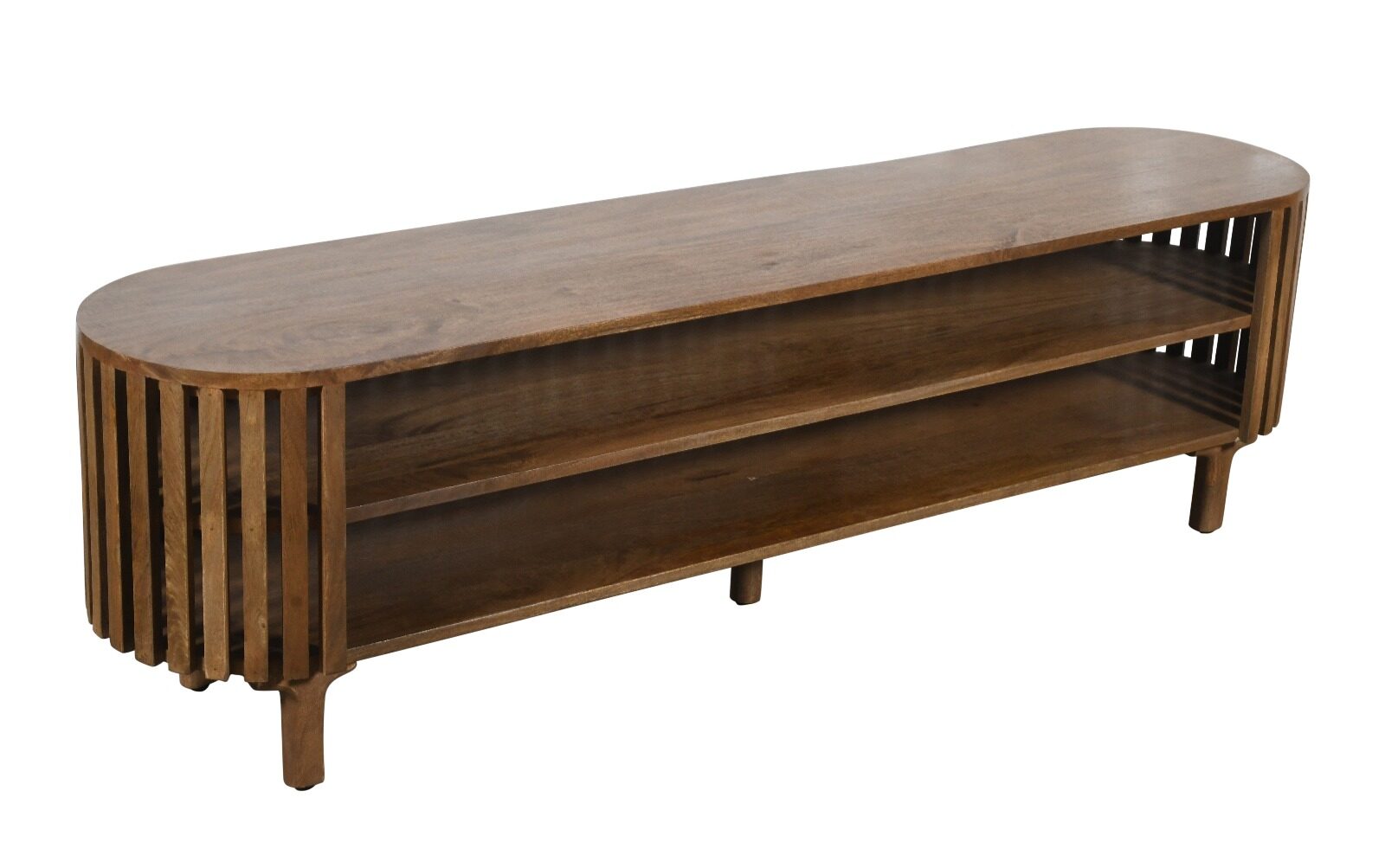 שידת טלוויזיה נמוכה ומעוצבת מעץ מנגו מלא בגוון טבעי. כוללת שני מדפים פתוחים שמתאימים לממיר, קונסולה, רמקולים או פריטים דקורטיביים. הפינות המעוגלות והקווים האנכיים מעניקים מראה אלגנטי וחם שמתאים לכל סגנון עיצובי.