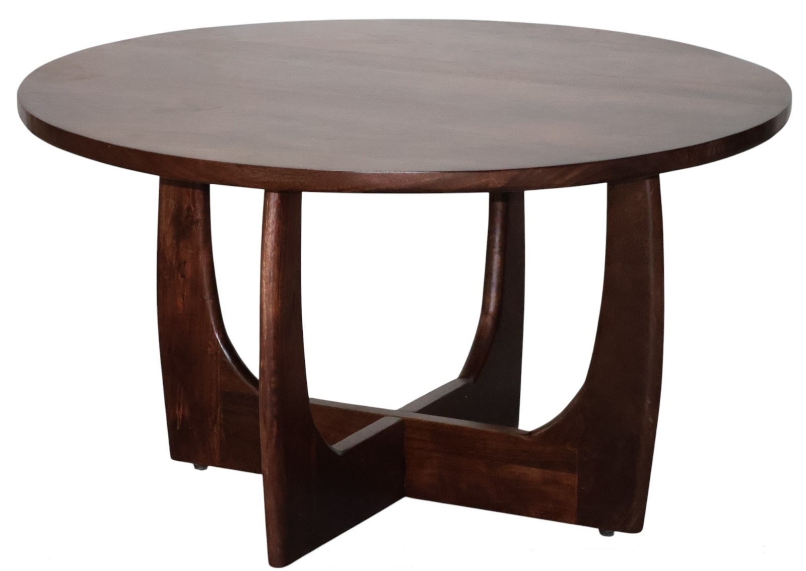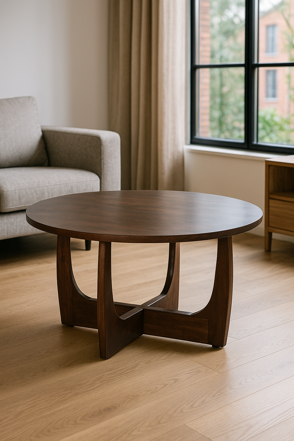 שולחן סלון עגול בקוטר 90 ס”מ עשוי עץ מנגו מלא בגוון כהה עמוק. עם רגליים מפוסלות בעבודת נגרות מוקפדת ובסיס מוצלב ליציבות מרבית. מתאים למרכז הסלון, מעניק חמימות ותחכום לחלל מודרני או קלאסי.