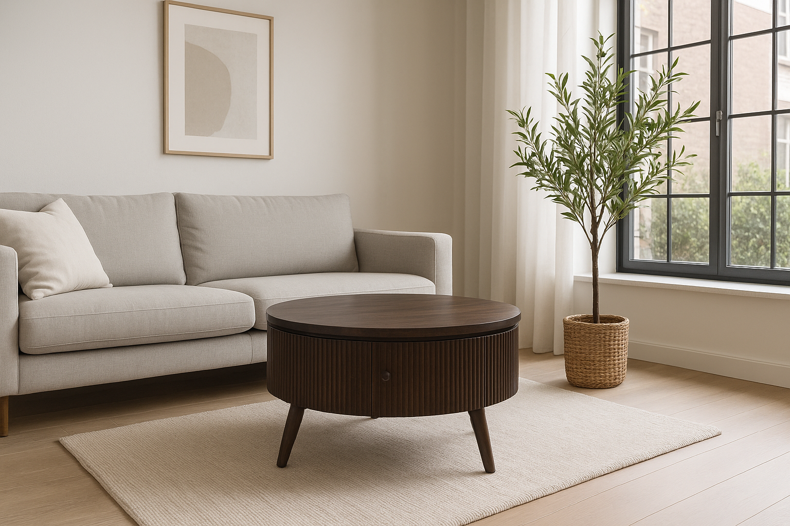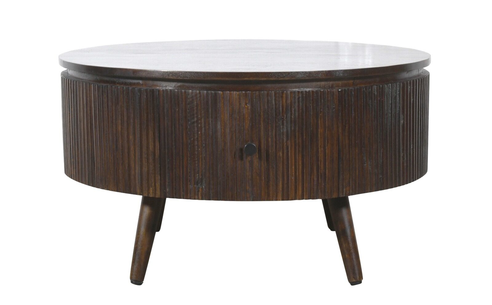 שולחן קפה עגול מעץ מנגו מלא בגוון כהה ועמוק, עם מבנה קומפקטי ועיצוב מודרני-כפרי. כולל מגירה נשלפת שמוסתרת בצורה נקייה במבנה העגול – פתרון מושלם לאחסון שלטים, פלייסמנטים או חפצים קטנים. רגליים אלכסוניות משלימות את המראה החמים והמעוצב.